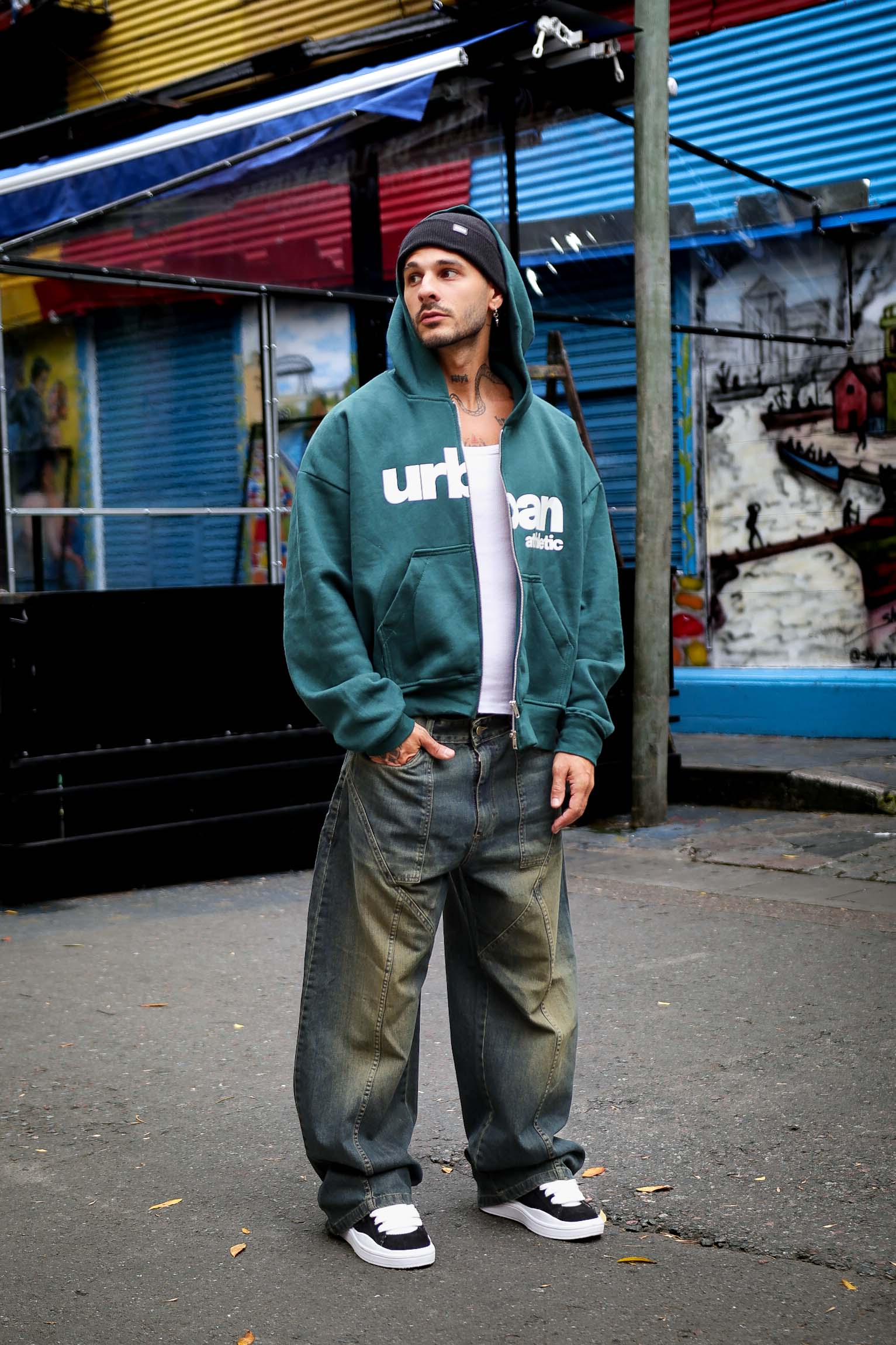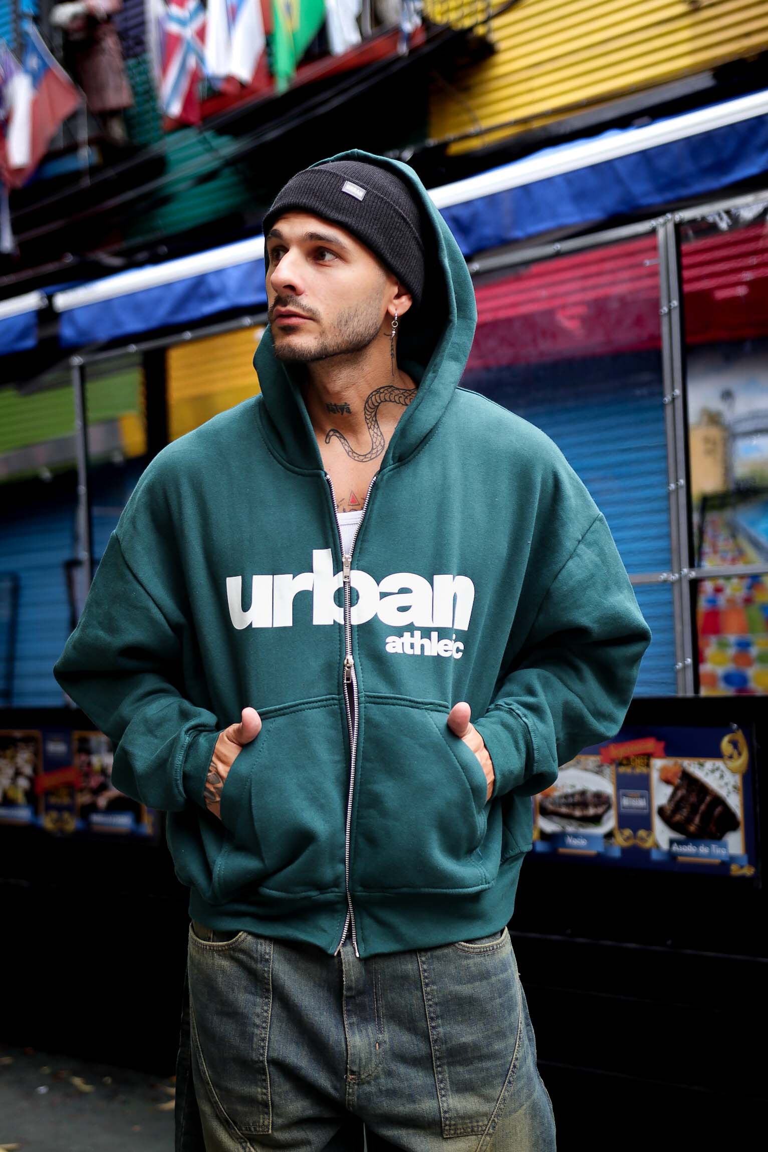 Modelo de diseño especial de corte boxy fit, capucha forrada, con estampado delantero en pecho, haciendo alución a nuestro slogan exclusivo de nuestra coleccion oficial de otoño, nos ofrece un modelo original y unico.
